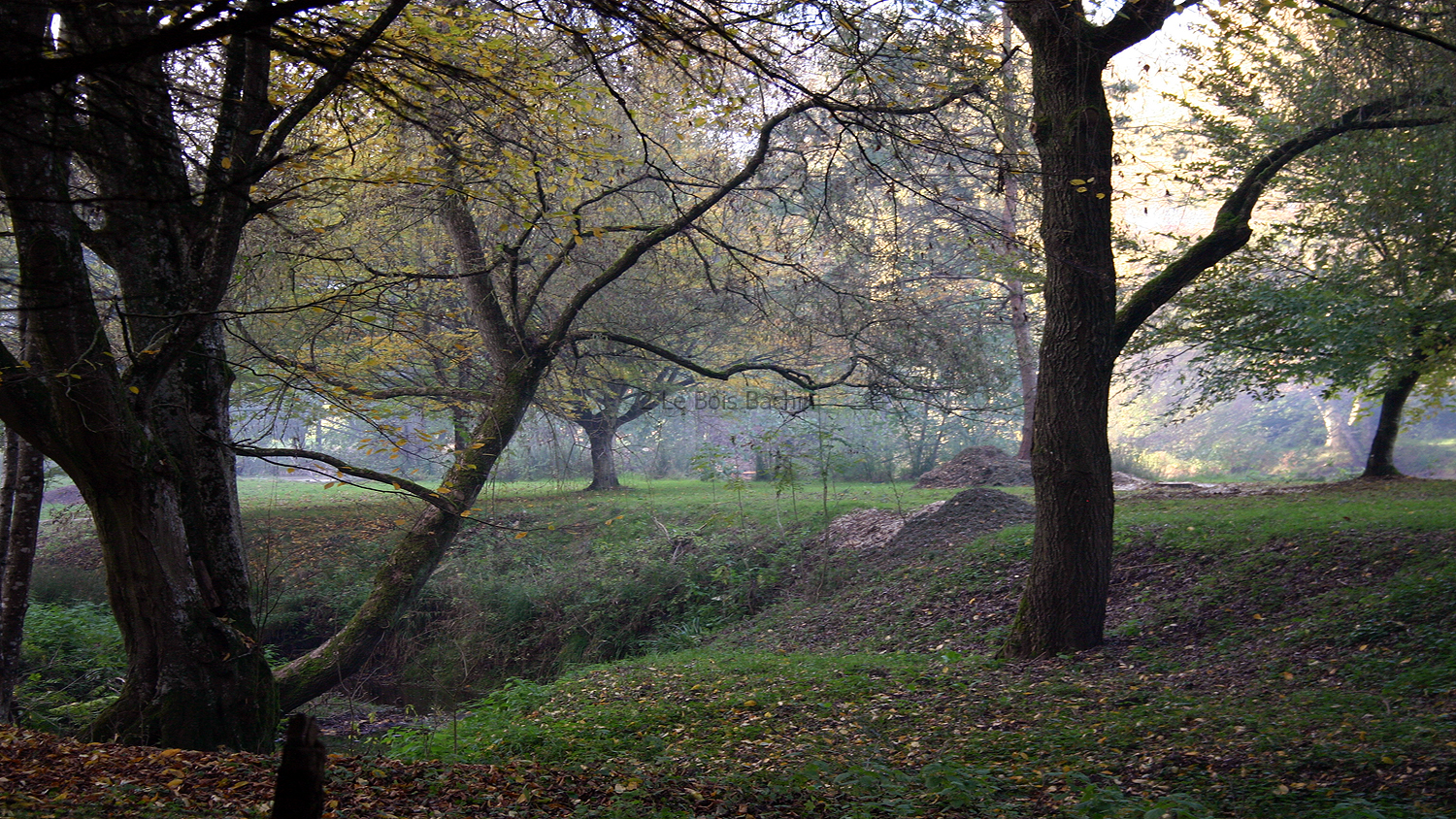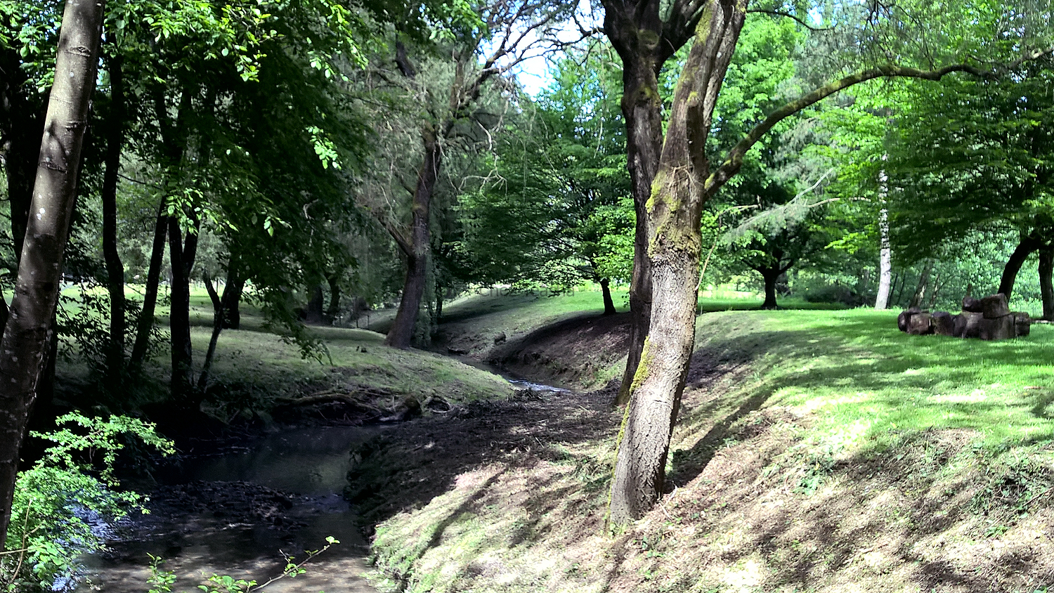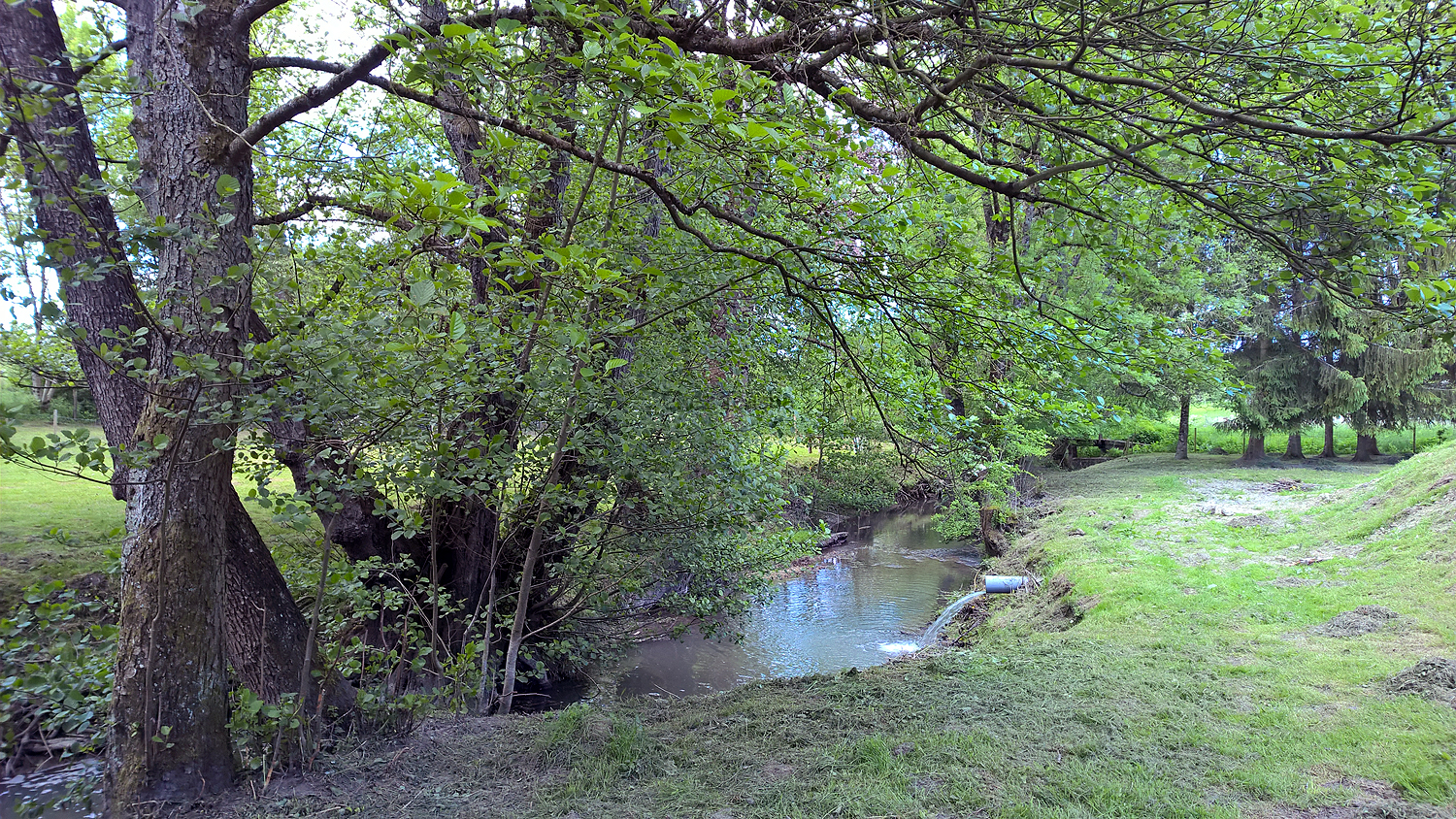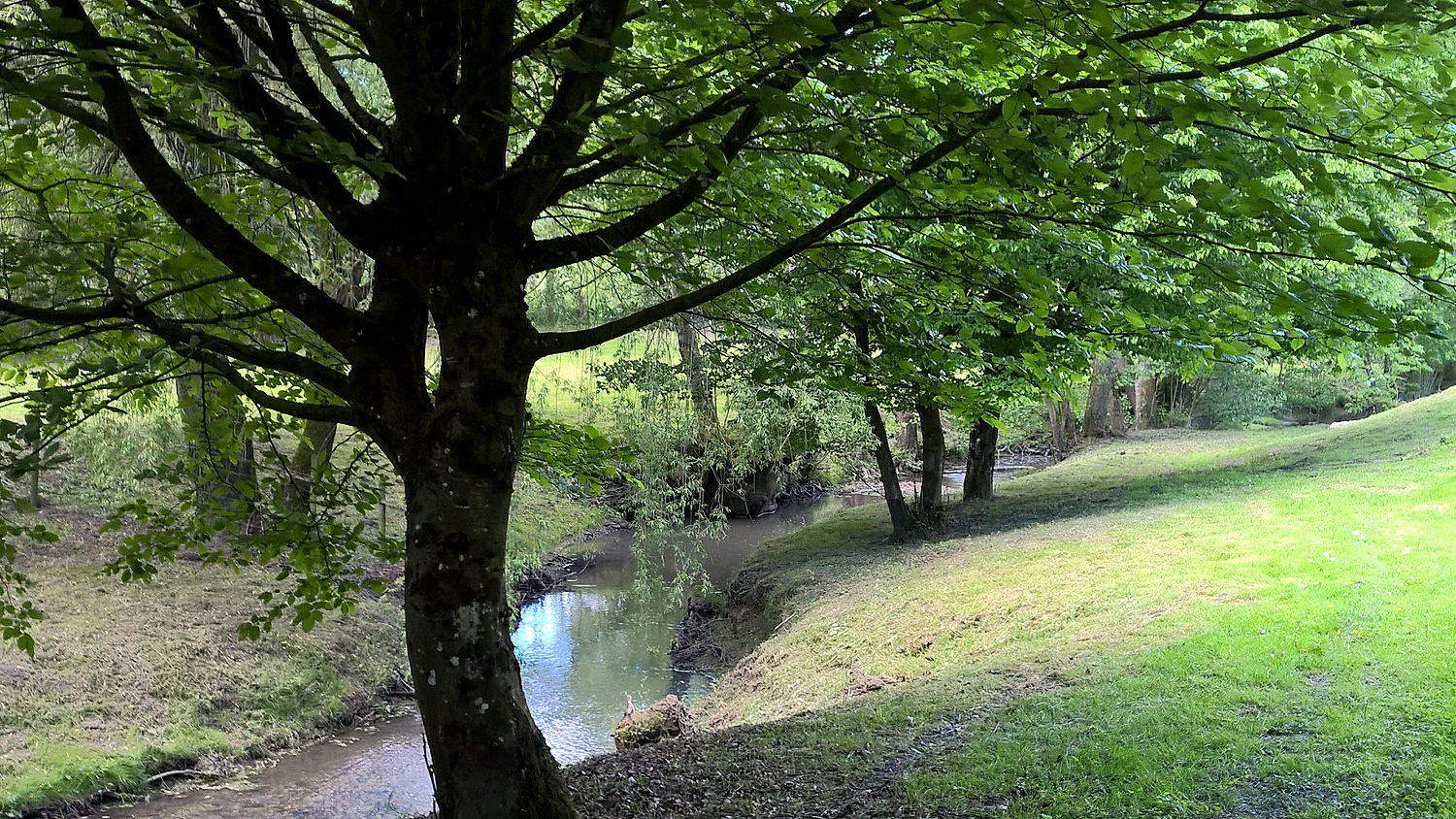 The banks of the stream which divides the lake from the fields.